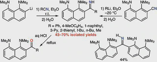 A series of 2-ketimines and 2,7-diketimines of 1,8-bis(dimethylamino)naphthalene (proton sponge, DMAN) have been obtained and converted into the corresponding ketones via acidic hydrolysis. Investigation of structural and spectral properties of DMAN-based imines led to the conclusion that their unusual hydrolytic stability results from a combination of different factors the most important of which is a strong electron-donor effect of peri-dimethylamino groups.
