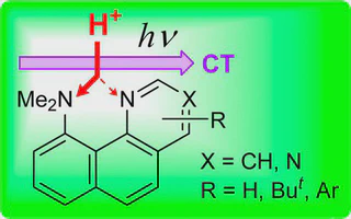 For the first time, 10-dimethylamino derivatives of benzo[h]quinoline 6 and benzo[h]quinazoline 7a–e as mixed analogues of archetypal 1,8-bis(dimethylamino)naphthalene (“proton sponge”) 1 and quino[7,8-h]quinoline 2a have been examined. Similar to 1 and 2, compounds 6 and 7 display rather high basicity, forming chelated monocations. At the same time, unexpected specifics of the protonated NMe2/—N═ systems consist of a strong shift of the NH proton to the 10-NMe2 group, contrary to the “aniline–pyridine” basicity rule. In case of 4H+, a rapid migration (in the NMR time scale) of the NH proton between two nitrogen atoms along the N–H···N hydrogen bond was registered at room temperature and frozen below −30 °C with the proton fixed on the NMe2 group. Two different approaches for classification of strong neutral nitrogen organic bases as proton sponges (kinetically inert compounds) or pseudo-proton sponges (kinetically active) are discussed. On this basis, benzoquinoline 6 was identified as staying closer to pseudo-proton sponges while 7a–e to proton sponges due to the presence in their molecules of bulky substituents in the pyrimidine ring. Other remarkable peculiarities of 6 and 7 are their yellow color and luminescence in the visible region distinguishing them from colorless 1 and 2a.
