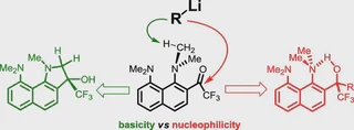 Reaction of 2-Trifluoroacetyl-1,8-Bis(dimethylamino)naphthalene with Strong Organic Bases: Acidic Ionization of 1-NMe2 Group Resulting in the Formation of Benzo[g]indole Derivatives versus Nucleophilic Addition to C=O Group