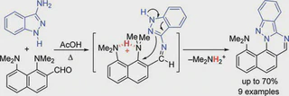 It has been shown that azomethines, hydrazones, and oximes derived from 2(7)-carbonyl derivatives of 1,8-bis(dimethylamino)naphthalene can undergo acid-catalyzed heterocyclization leading to a nucleophilic displacement of the 1-NMe2 group. The process is believed to be directly connected with the proton sponge nature of the substrates, in which 1-NMe2, being a poor leaving group, is preliminary activated via the formation of a chelated protonated form. A number of difficult to access derivatives of benzo[g]indazole, benzo[g]quinazoline, naphtho[2,1-d]isoxazole, and 8-dimethylamino-1-naphthol have been prepared in moderate to high yields.
