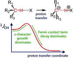One-bond coupling constants 1JXY are usually used as a measure of the corresponding X⋯Y interatomic distances. However, the physical nature of this correlation is not well understood and, in some cases, a counterintuitive behaviour of 1JXY upon hydrogen bonded complex formation has been reported. In this work, the behavior of 1JCH upon formation and strengthening of complexes with CH⋯X hydrogen bonds and upon a proton transfer process is investigated by means of 1H NMR spectroscopy and quantum chemical calculations. 1H NMR spectra of 1,1-dinitroethane solution at room temperature in various solvents (carbon tetrachloride, chloroform, dichloromethane, acetone, dimethylformamide and dimethyl sulfoxide) illustrate the increase of 1JCH by several Hz upon an increase of the complex strength. Computational results (MP2/aug-cc-pVDZ) reproduce this observation and allow one to conclude that the increase of 1JCH is mainly caused by the change of the carbon hybridization (an increase of s-character), rather than by the change in interatomic distance rCH. The behavior of 1JCH was also examined computationally for a wide range of CH⋯X hydrogen bond energies and geometries. For this purpose, quantum-chemical modeling of the partial proton transfer process for complexes formed by 1,1-dinitroethane and trinitromethane as hydrogen bond donors with acetone, pyridine and fluoride anion as hydrogen bond acceptors was performed. The obtained results have confirmed the above-mentioned idea – for rather weak complexes, the dominant impact on the change of 1JCH magnitude is the increase of the s-character of carbon atom hybridization, while for complexes with a significantly transferred proton, the exponential decrease of the Fermi-contact term dominates.