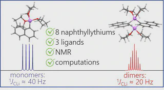 The aggregation of a series of mono- and dilithionaphthalenes in THF solutions in the presence of tetramethylethylenediamine (TMEDA) and pentamethyldiethylenetriamine (PMDTA) was studied by NMR spectroscopy and quantum chemical calculations. The stability of dimeric species in diluted solutions as well as reasons of their disaggregation in some cases has been discussed. For the lithioderivatives of 1,8-bis(dimethylamino)naphthalene (DMAN) the possibility of NMe2 group coordination to the lithium atom in ortho-position of naphthalene core under steric pressure of substituents was demonstrated by quantum chemical calculations. For the first time, dilithionaphthalenes were studied by 1H, 13C, and 7Li NMR spectroscopy. It was shown that while β-dilithionaphthalenes form oligomeric aggregates in solutions, α-dilithionaphthalenes exist as solely monomeric species with each lithium atom coordinated to both peri-positions.
